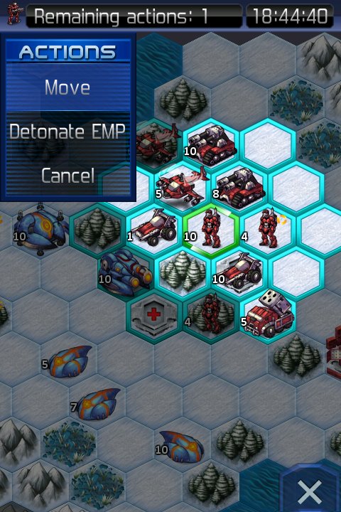 The units that can cause transformation also have special abilities that will affect units of a specific race that are within range. When these abilities appear in the Action Menu, highlight them to view the range and select them to activate. The EMP will disable Titan units within range for one full round, allowing others to attack them without taking damage. The UV will deal one point of damage to all Sapien and Khralean units within range. The Plague will poison nearby Sapien units for the remainder of the game until the units repair at a Medical terrain or next to an Engineer. At the beginning of every turn for the infected player those poisoned units will lose one point. Any units that are next to a poisoned unit at the start of the unit will catch the plague and be poisoned as well.
